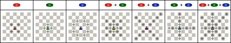 Figures with no rings cannot move. The red, green and blue rings represent different powers (the golden rings are special - see the next section). When a ring is placed on a figure it gives it a certain 'power' to move according to the ring's color. When two or three rings of different colors are placed on a figure the powers combine.