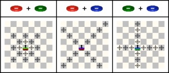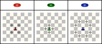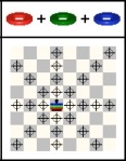 b) Pick up a free ring (one that is not placed on a figure) and place it on one of the adjacent figures (each square has 8 adjacent squares). However, to be able to pick it up the ring must be surrounded by more of your own figures than your opponent's (counting all figures on the 8 adjacent squares).